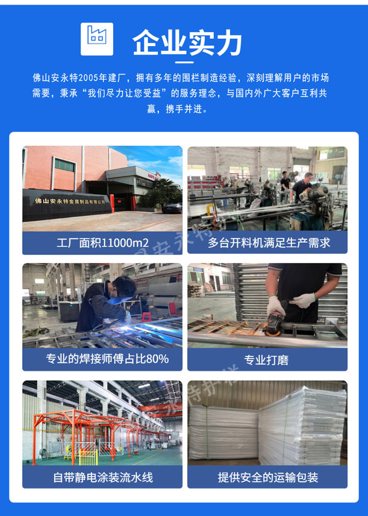 佛山安永特主营产品为市政道路护栏、锌钢围栏、港式护栏、京式护栏等各式护栏;公司拥有10000+㎡工业化厂房,从原材料到成品的一整条先进生产线,是一家集生产、定制、销售、配送、安装为一体的市政道路交通护栏生产厂家。